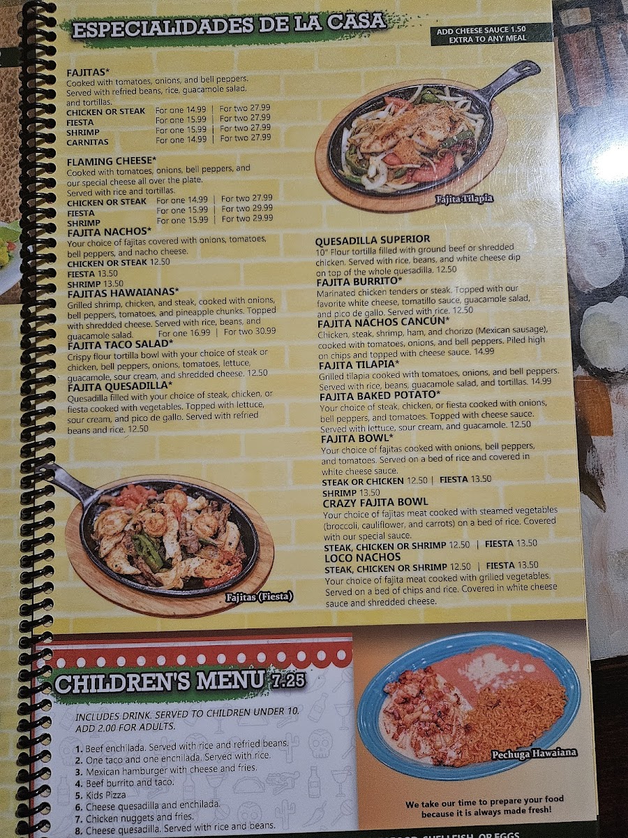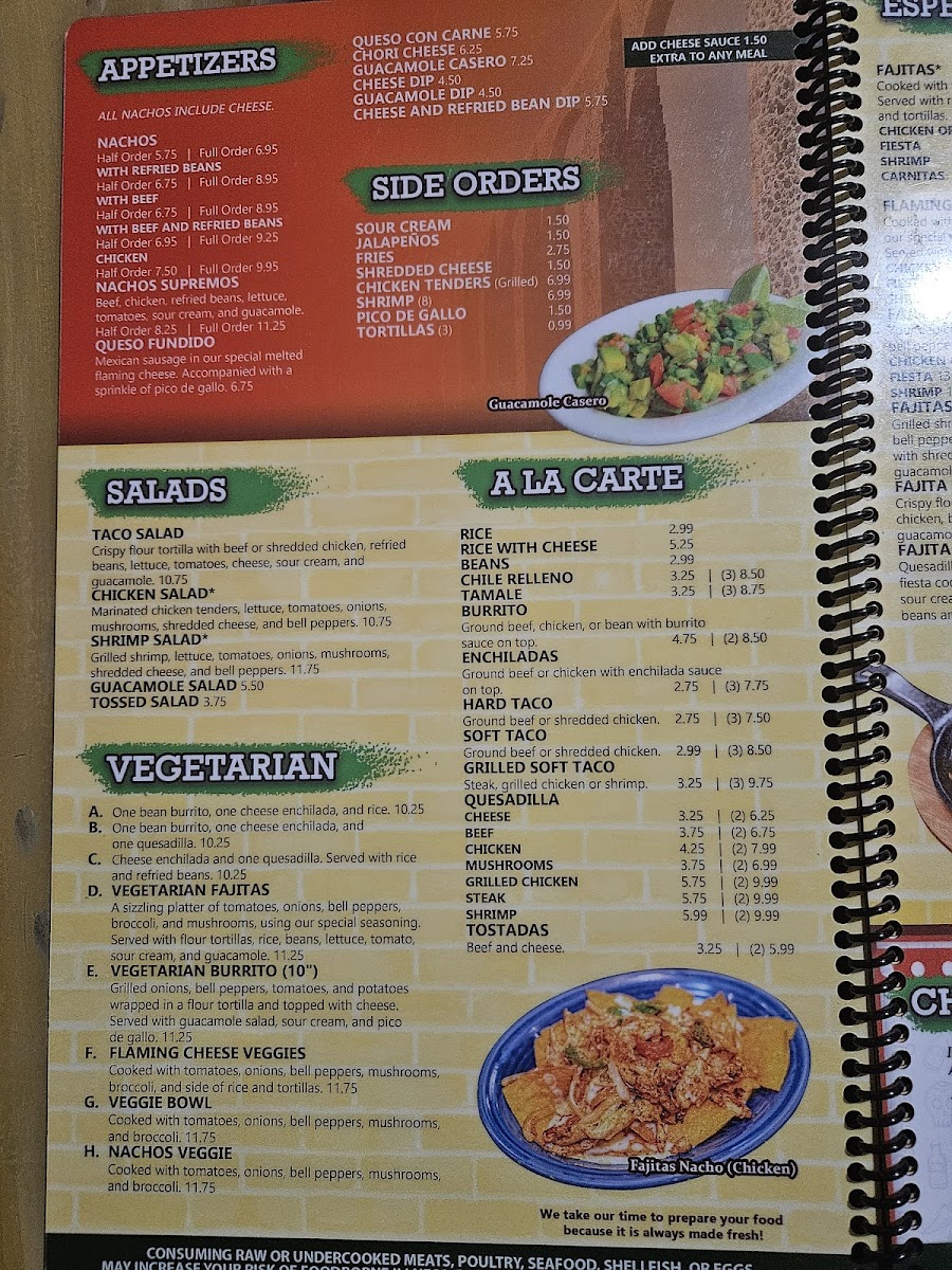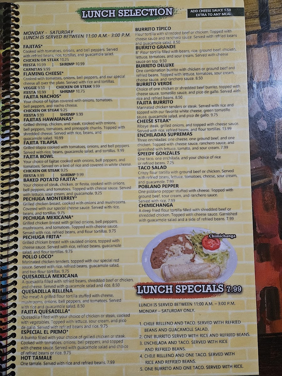 Typical favorites include a variety of mixed plates such as stuffed poblano peppers topped with savory ground beef and creamy ranchero sauce, or crispy chimichangas filled to order with shredded meats. For lighter yet satisfying options, the fajita taco salad provides a colorful mix of fresh vegetables, melted cheese, and your choice of protein served in a crisp tortilla bowl.